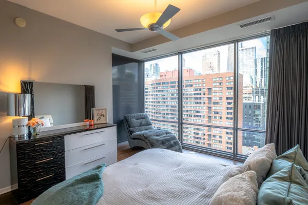 Welcome to luxurious living in this stunning 16th floor 2 bed, 2 bath condo in heart of Streeterville! This spacious unit features floor to ceiling windows with grand views of the skyline and Hancock Center building, hardwood floors throughout, and an open kitchen with beautiful custom cabinetry and stainless-steel appliances (Fridge new 2025), granite counter tops, and custom back splash. The second bath is slate with mosaic glass tile floor, a brand-new toilet, and a shower/tub combo. Retreat to your beautiful primary suite with panoramic views of the city through gorgeous windows, walk-in closets with professional organization, and a spacious en suite bathroom with a double vanity, a brand-new toilet, whirlpool tub, and stand-alone shower. There is also a private balcony accessible from the living / dining room. Freshly painted with wonderful views, washer dryer in-unit, and a premium parking space for an additional $50,000. This secure building is private and has 24 hour door staff, management on site, and offers full amenities such as 2 fitness rooms, outdoor pool, private rooftop park, community room, theater room, and business center. Whole Foods, restaurants, Michigan Ave and Navy Pier are all within minutes of walking! Shopping and the lakefront out your door! Walkable to Northwestern Hospital.